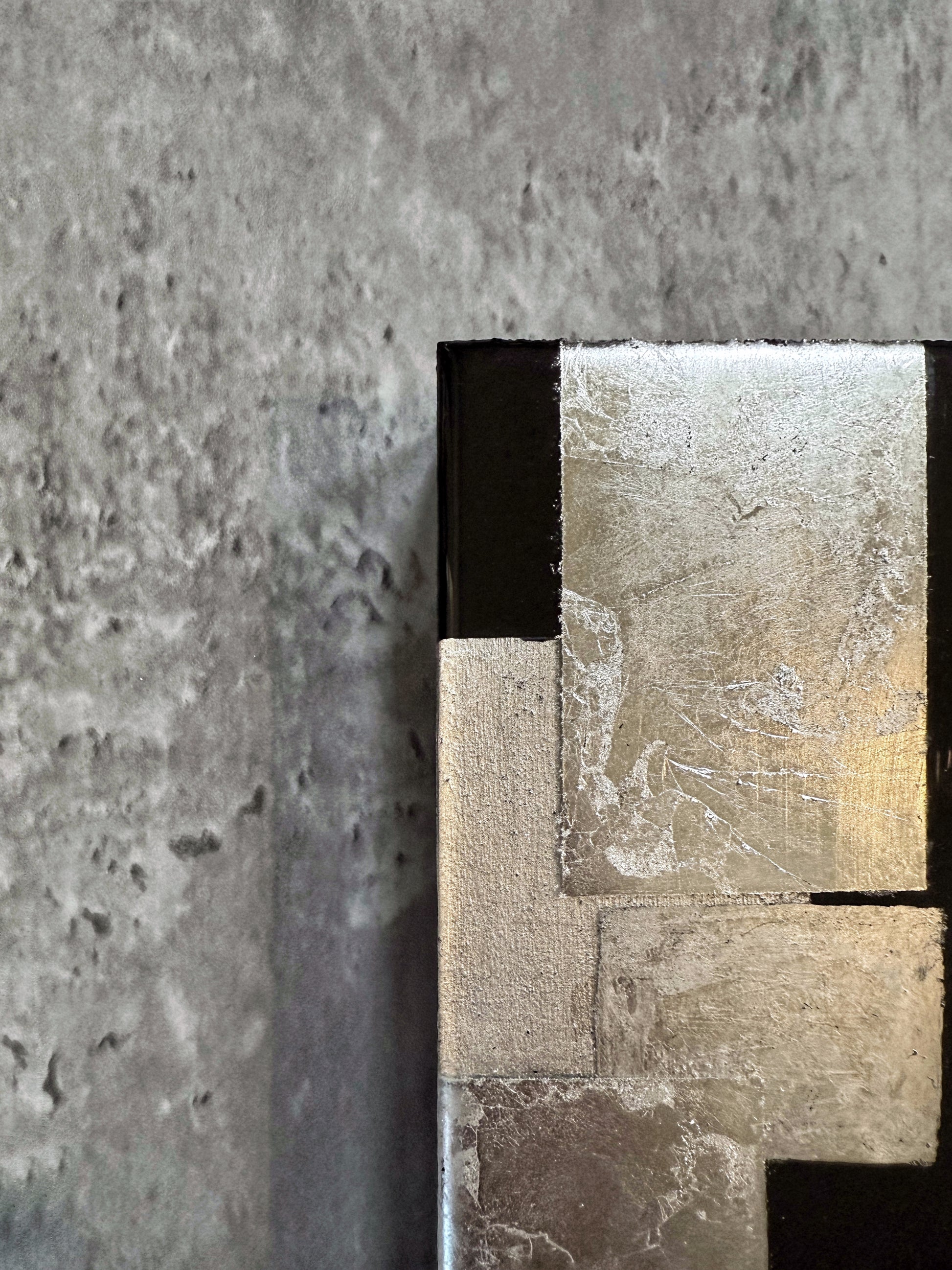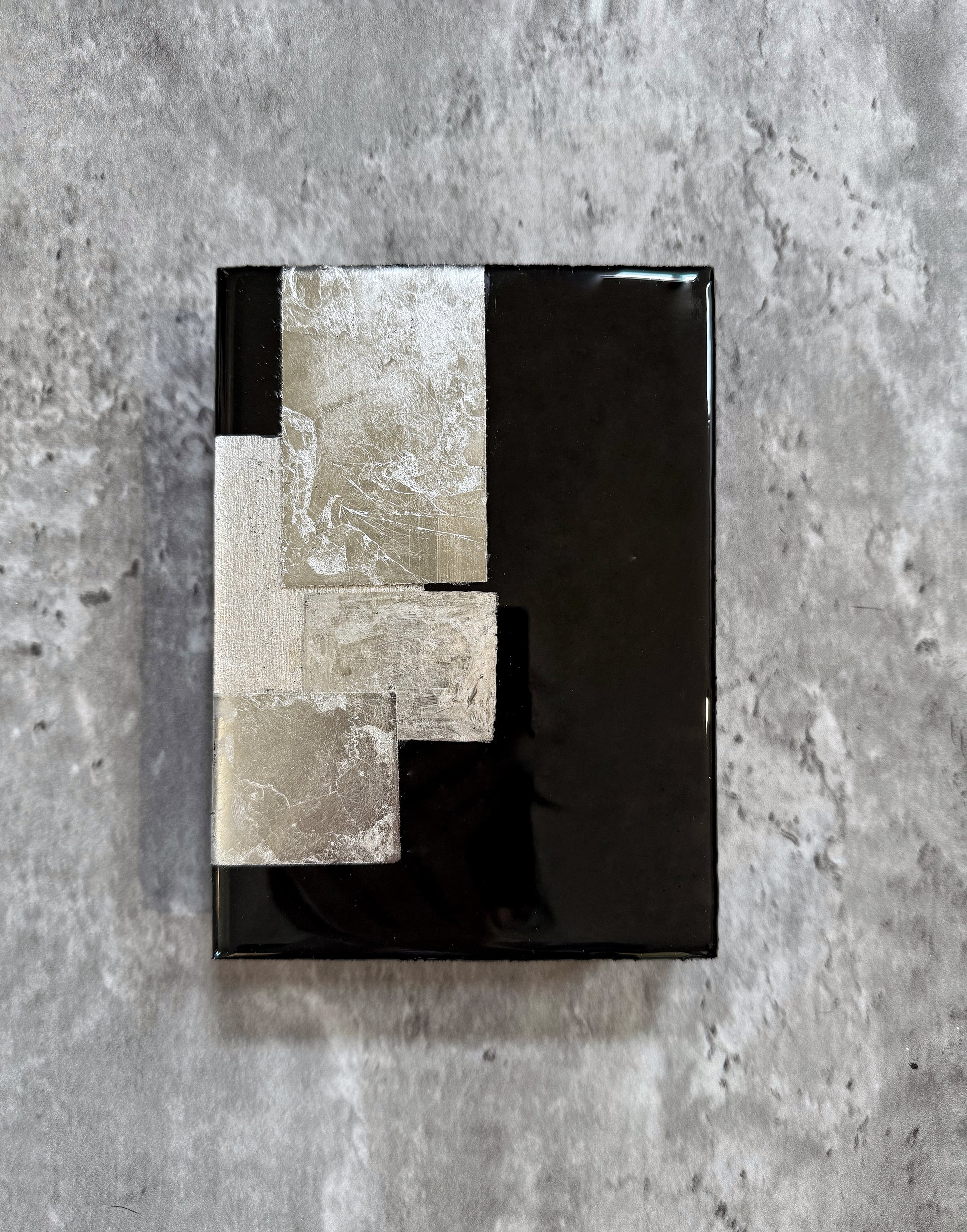 A Breath Between Worlds captures the quiet pause between what is seen and what is felt. Textured layers of silver metallic pigment meet a deep, glossy black resin surface — creating a visual harmony of reflection, stillness, and depth.